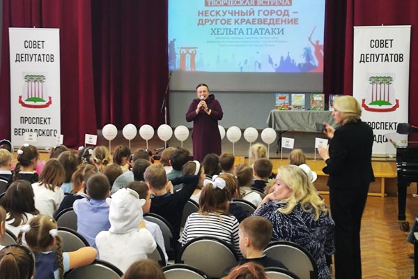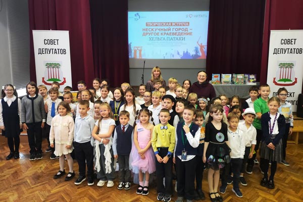 Книги приглашенной писательницы Хельги Патаки в основном по краеведению, изучению истории нашей страны и Москвы. На экране, в виде викторины, были представлены некоторые города России, которые участники мероприятия должны были отгадать. Писательница зачитывала отрывки из самых известных своих книг о Москве, об Арбате, о Туле, о Санкт-Петербурге, изложенных доступным для детского восприятия языком. Проведена небольшая пресс-конференция и ребята с большим интересом задавали интересующие их вопросы, состоялся очень познавательный диалог.