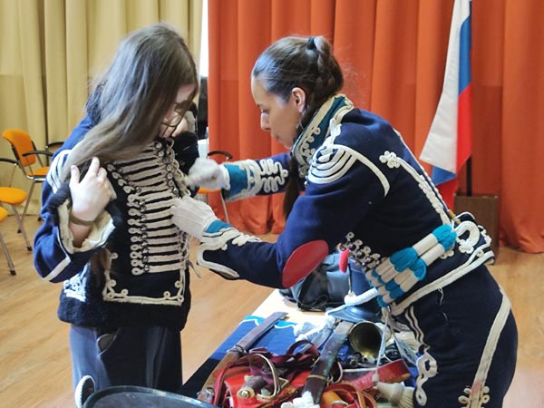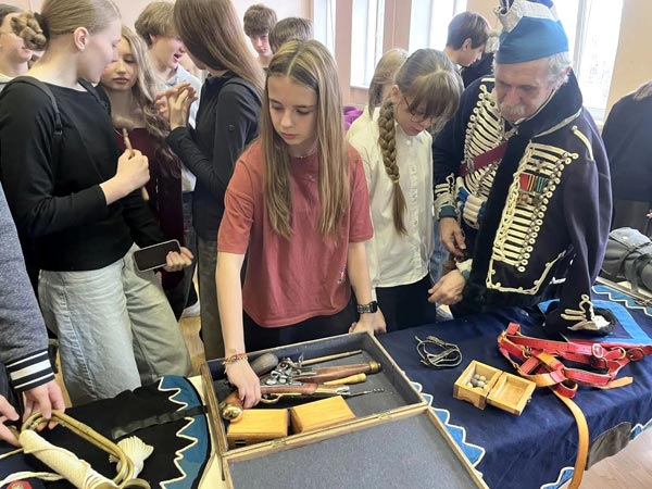Ребята получили редкую возможность увидеть и даже прикоснуться к подлинным предметам той эпохи: элементам экипировки, вооружению и деталям униформы, включая мундиры кавалерии и пехоты. Это позволило им установить связь с прошлым и представить, как выглядели и чем пользовались герои, защищавшие Родину.